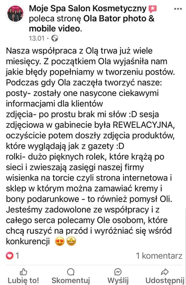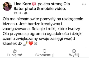 Mimo wybrania na początku innej ścieżki zawodowej, kreatywna praca podobała mi się najbardziej i tak też zaczęłam tworzyć filmy reklamowe. Ukończyłam kurs z nagrywania mobilnego wideo, co sprawia, że narzędzie pracy mam zawsze przy sobie.